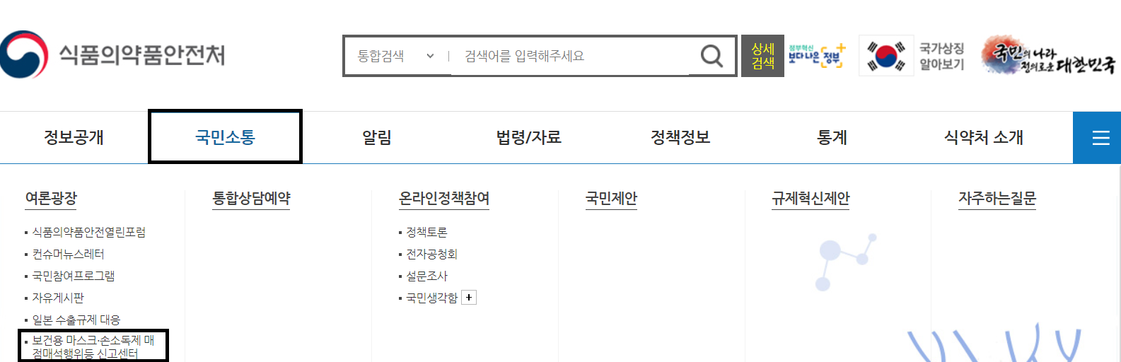 식품의약품 안전처 홈페이지 - 국민소통 - 매점매석 행위 등 신고센터에 들어가서 할 수 있습니다.