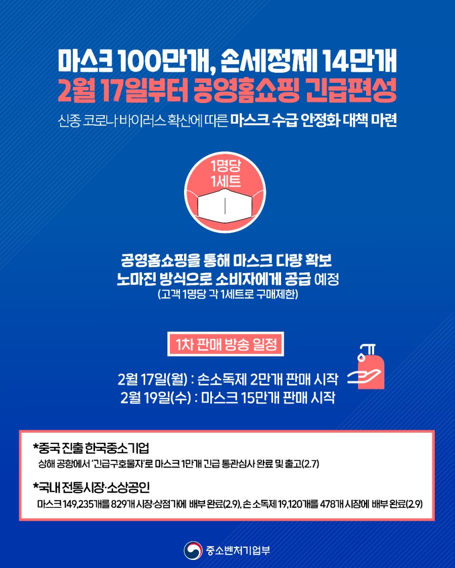 마스크 공영홈쇼핑 공급예정 중소벤처기업부에서는 마스크, 손소독제 품귀현상에 따른 부작용을 최소화 하고자