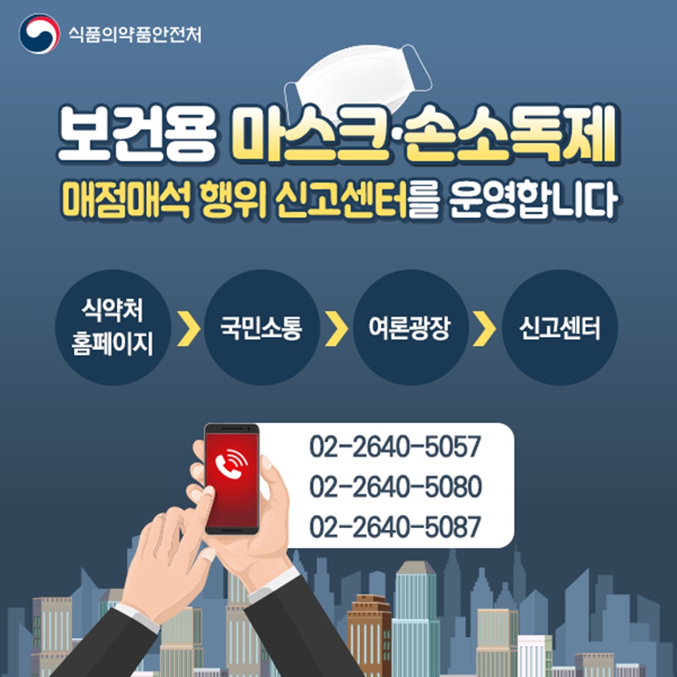 매점매석 신고방법 보건용 마스크 및 손소독제 매점매석 행위 신고센터를 국가에서 운영하여 처벌을 실시합니다.