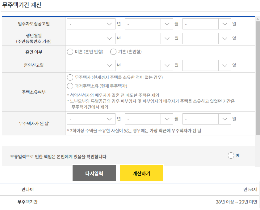주택소유여부 및 무주택시점을 확인하여 입력해주면 만 나이를 기준으로