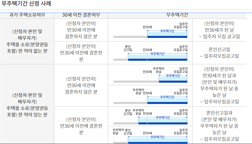 기혼자 : 혼인신고일과 무주택자가 된 날중 늦은날 ~ 공고일 사이 기간입니다.