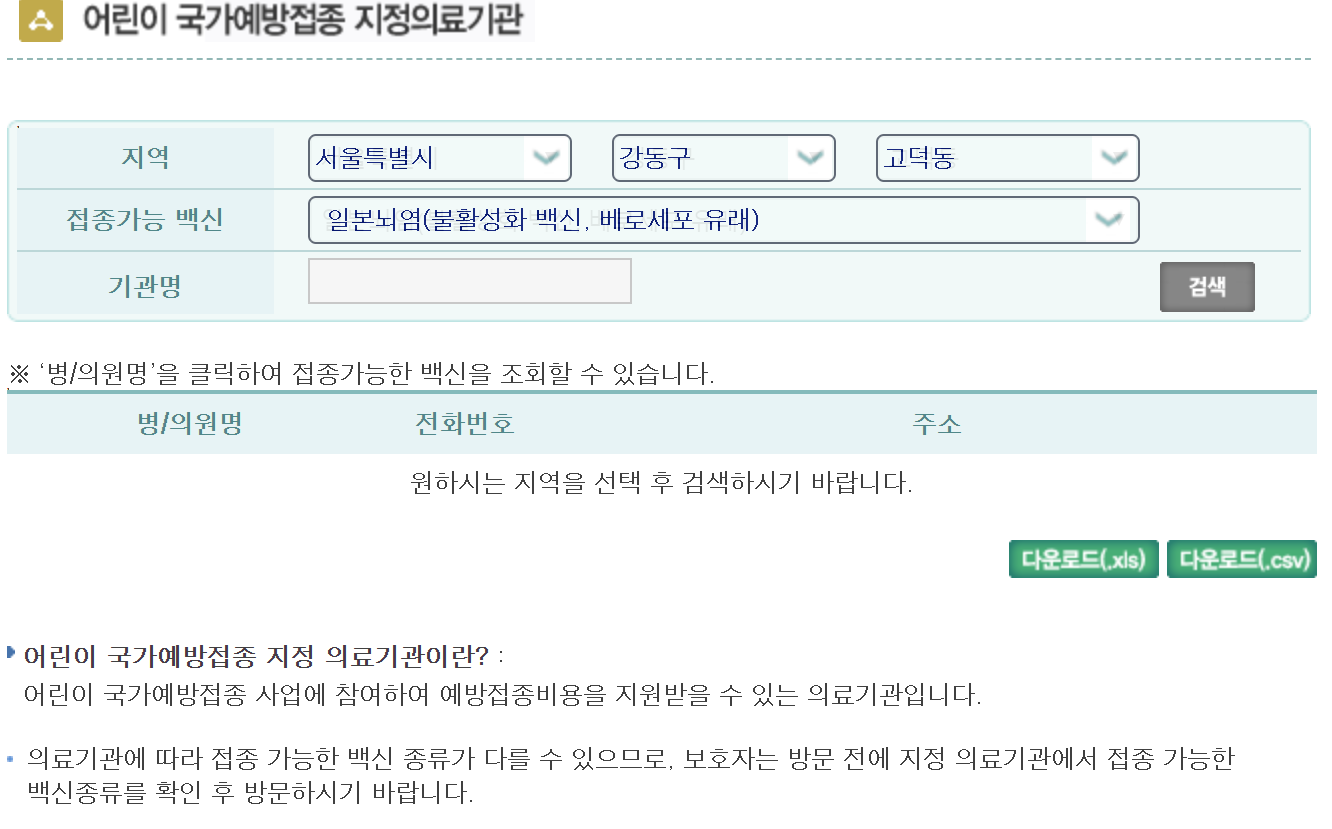 어린이 국가예방접종 지정의료기관 검색 자신이 사는 지역 및 원하는 백신 종류를 검색하면