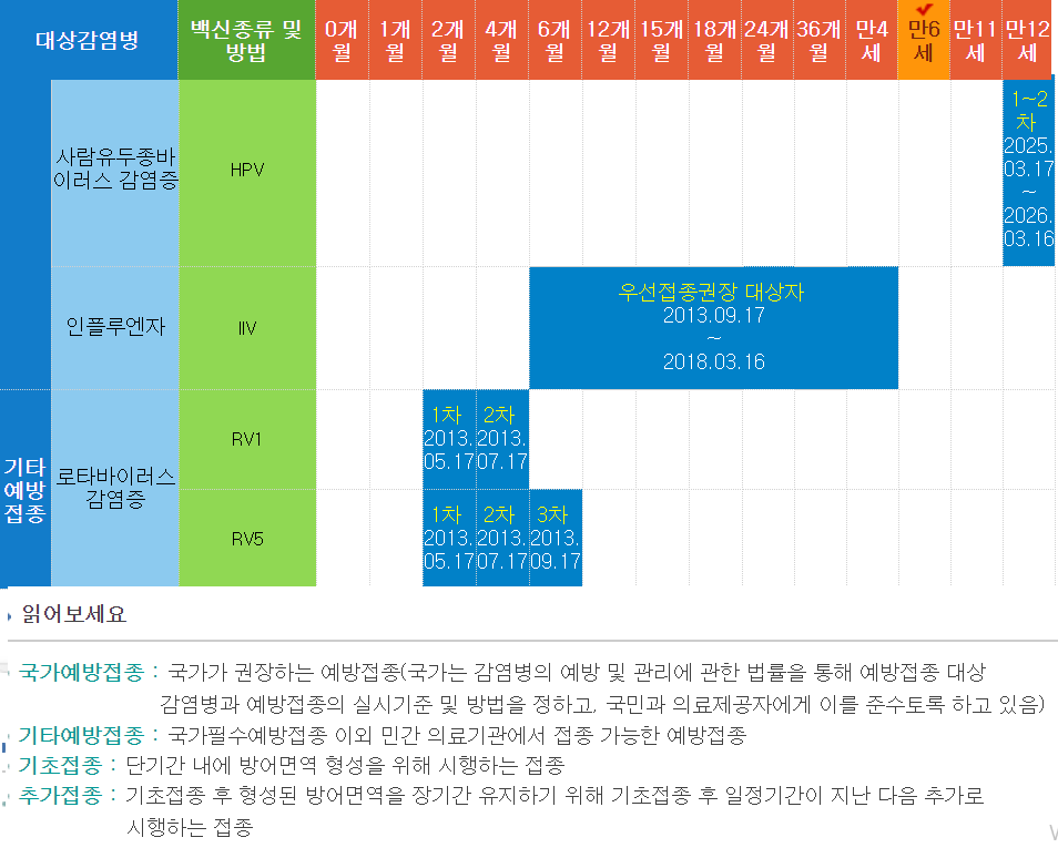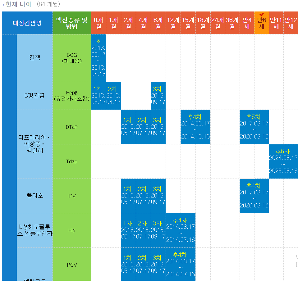 2013년생 예방접종목록 태어나자마자 결핵 백신부터 시작해서 만 6~7세가 지금 1학년들이 되겠죠.