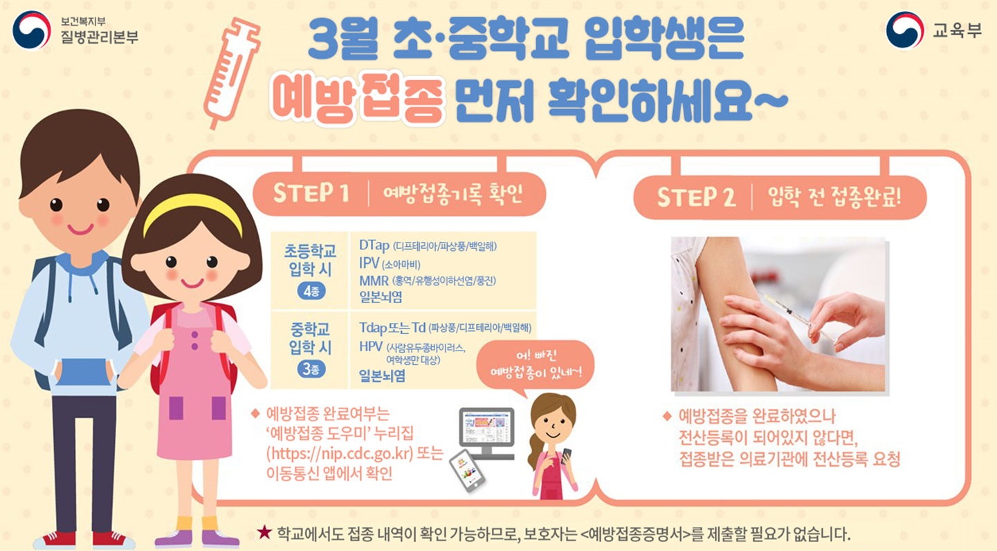 여기에 올해부터는 중학교 입학 시 일본뇌염까지 추가되어 무료접종이 가능합니다!