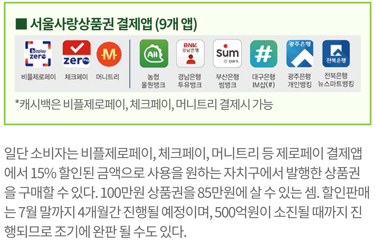서울시는 상품권 할인율을 15% 캐시백 5%를 제외하고도