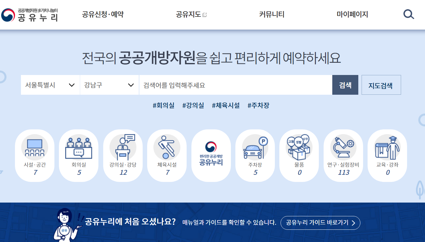 공유누리 사이트 공유누리에 있는 공공시설에는 종류가 참 다양한데요.