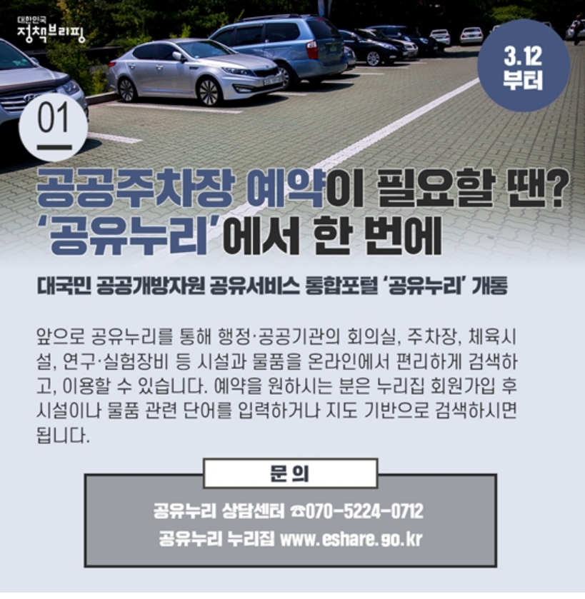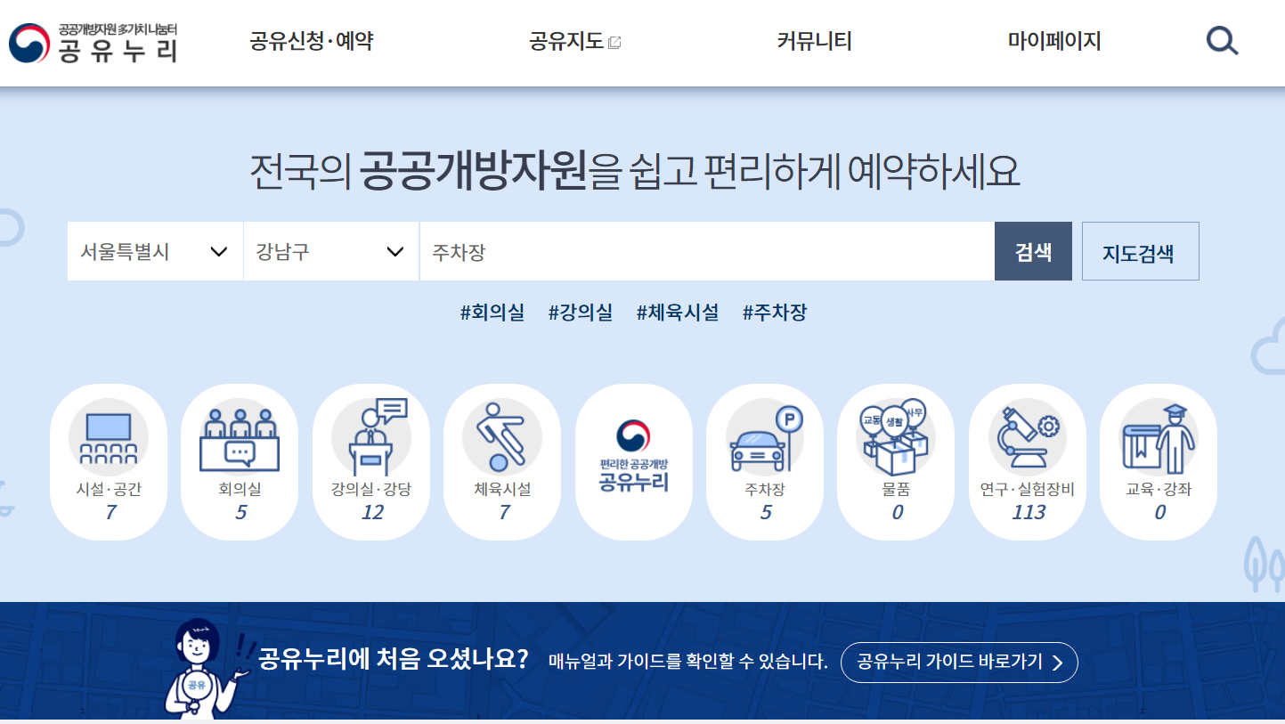 공유누리를 통해 행정·공공기관의 회의실, 주차장, 연구·실험장비 등 시설과 물품을