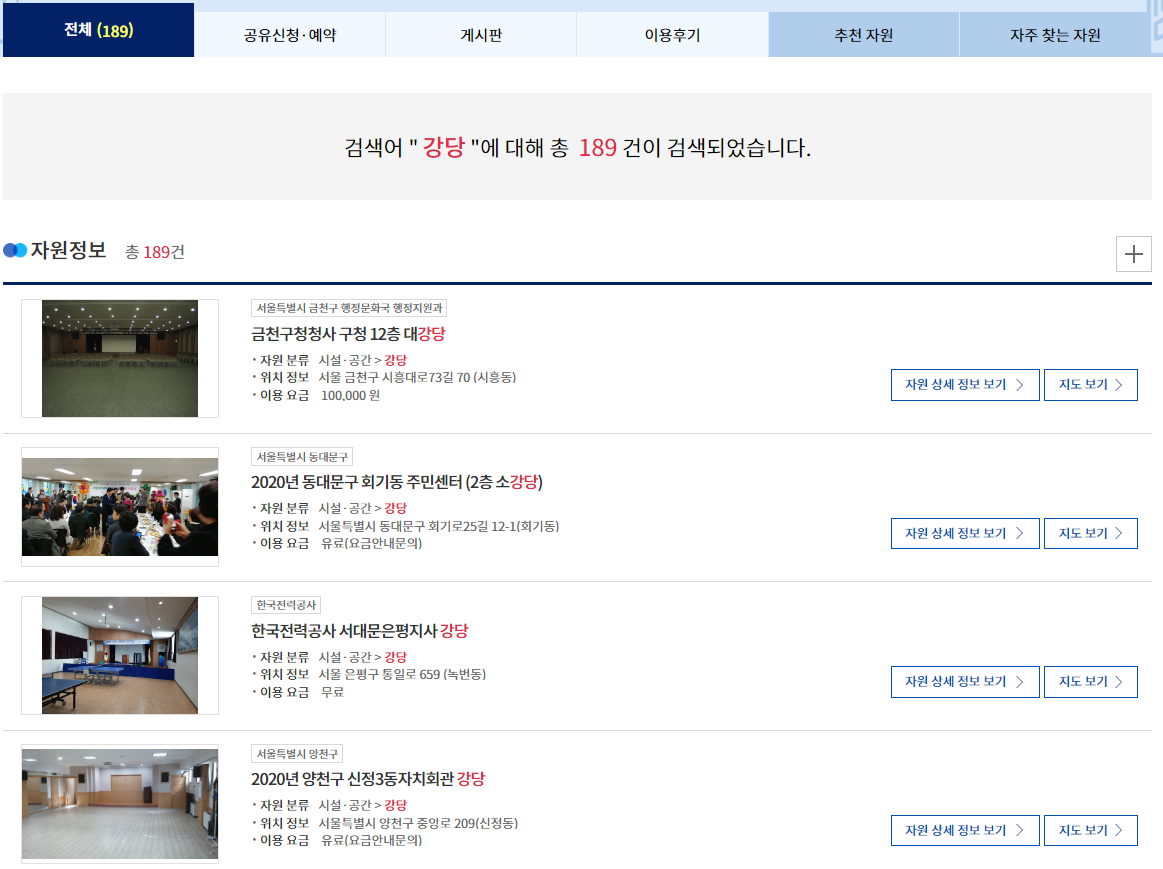 서울시 강당 대여 서울시에서만 검색하여 빌릴 수 있는 공공기관 강당수가 189건으로 나왔네요!
