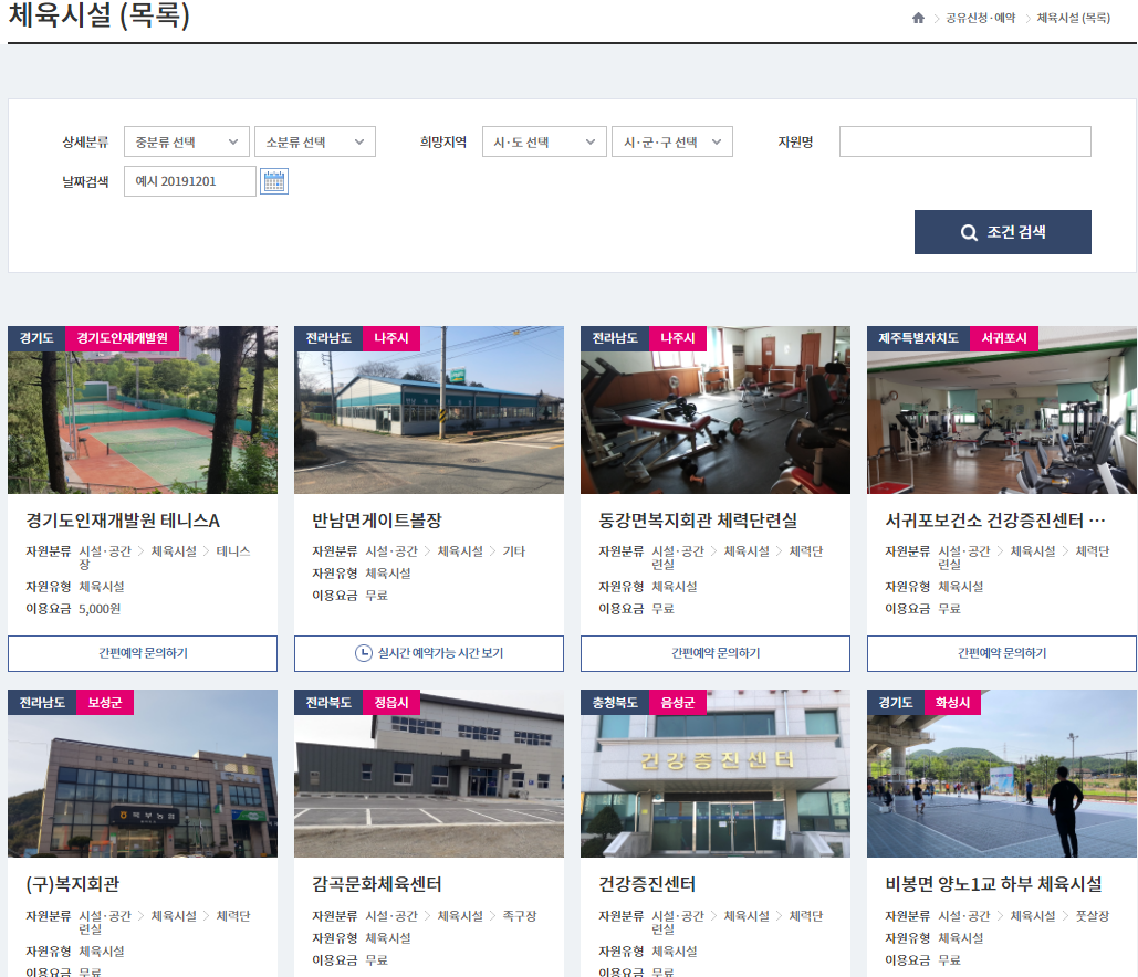 예를 들어 체육시설에 대해서 빌리고 싶은 분들은 위와 같이 찾아볼 수 있는데요.
