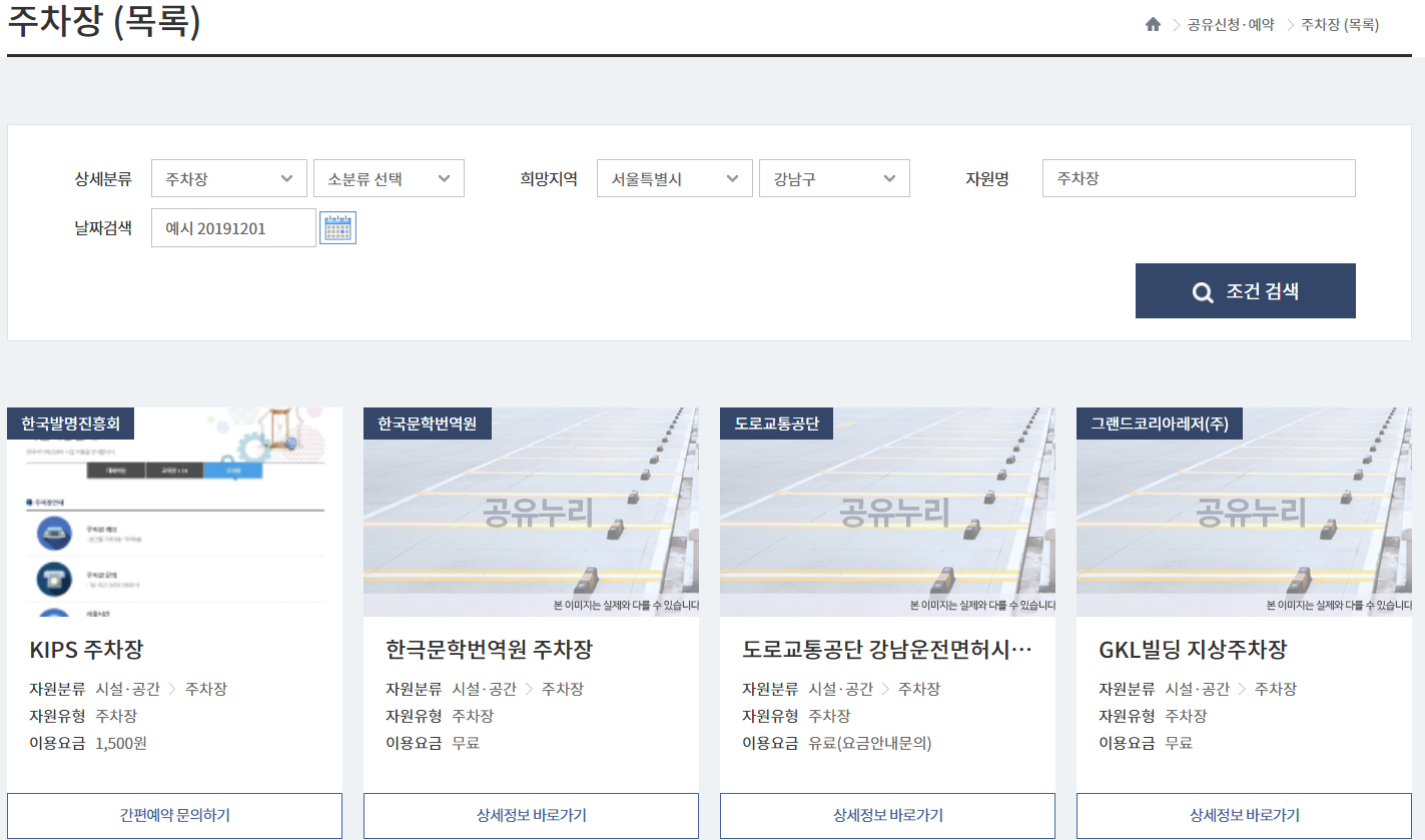 공유누리에서는 체육시설, 공공주차장, 공영주차장 예약은 물론