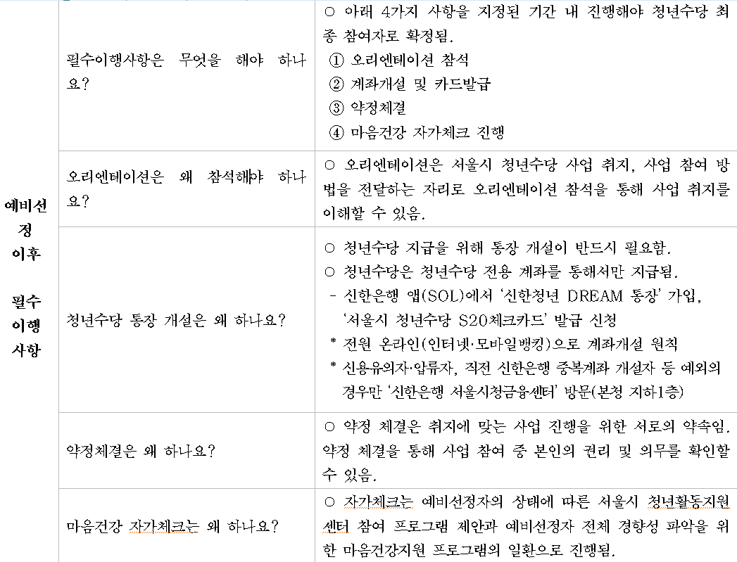 청년수당 선정 시 필수이행 사항 신청을 완료한 뒤 청년수당 사업에 선정될 경우 필수로 해야 하는 사항들이 있습니다.