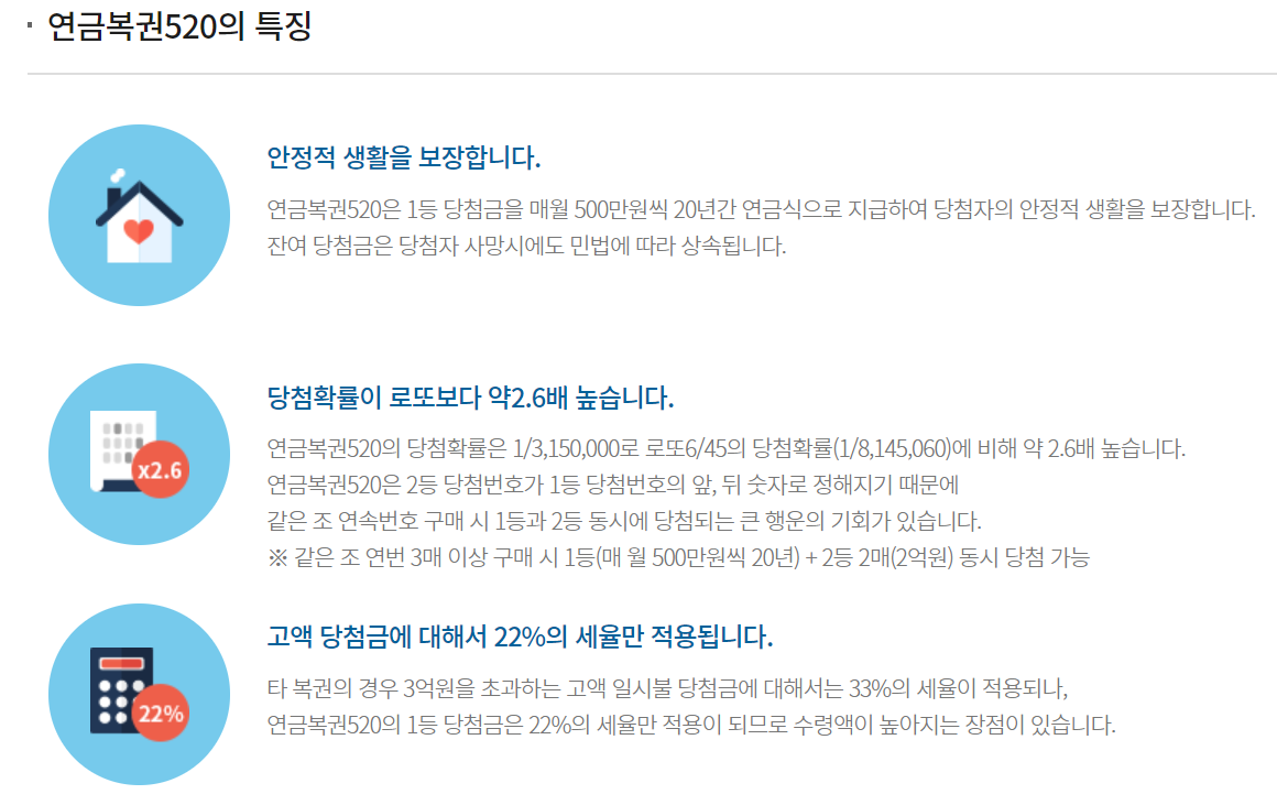 연금복권 세금 연금복권 1등에 당첨되면 매월 500만 원씩 20년간 받게 되어 총 12억 원을 받습니다.