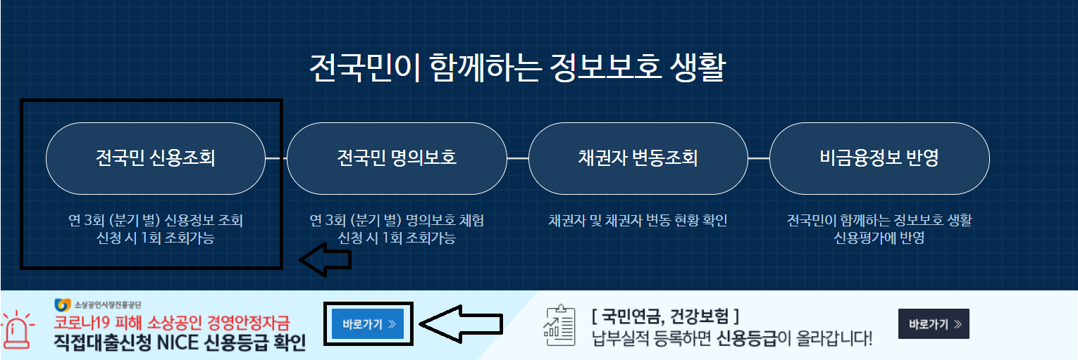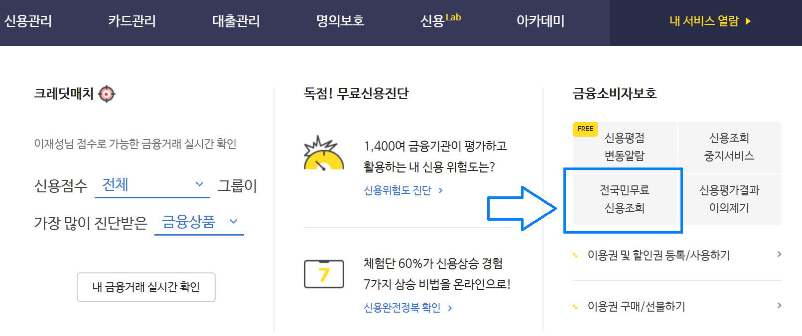 오른쪽에 보면 전국민무료신용조회 버튼이 있습니다.
