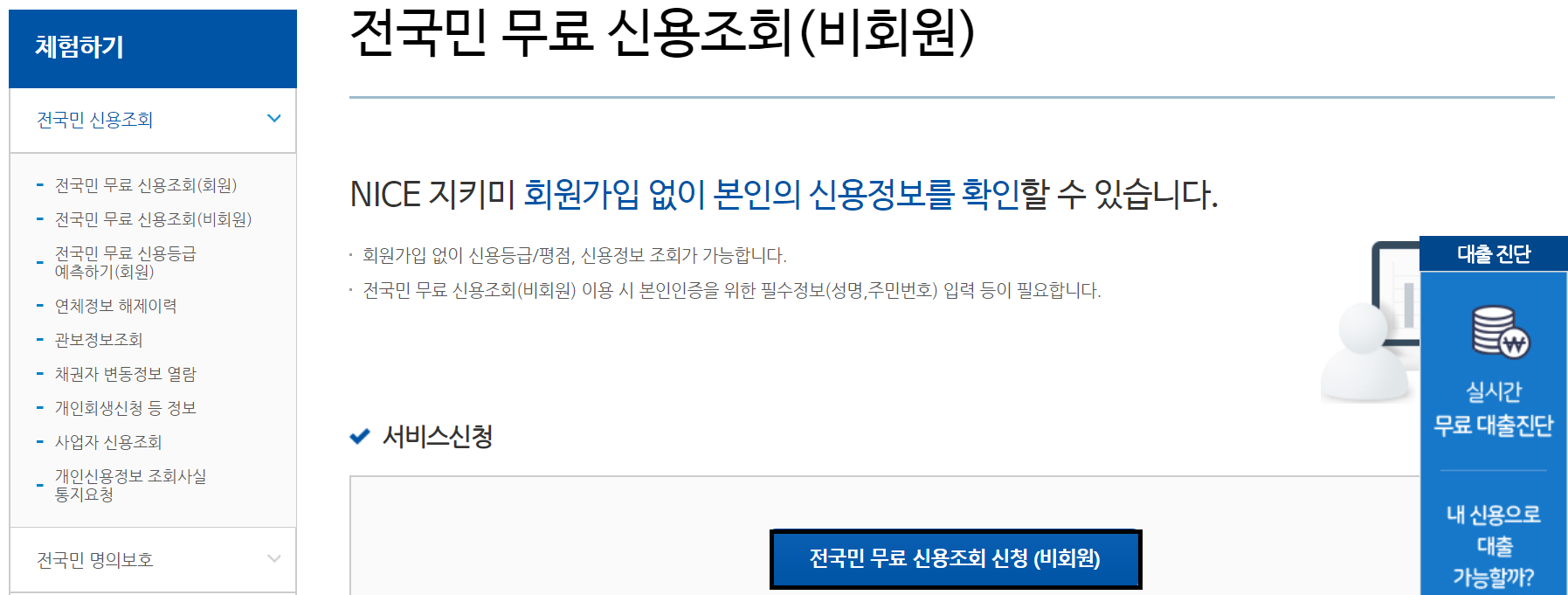 나이스지키미 전국민무료신용조회 마지막으로 살펴볼 곳은 나이스지키미 전국민 무료신용등급조회 서비스입니다.