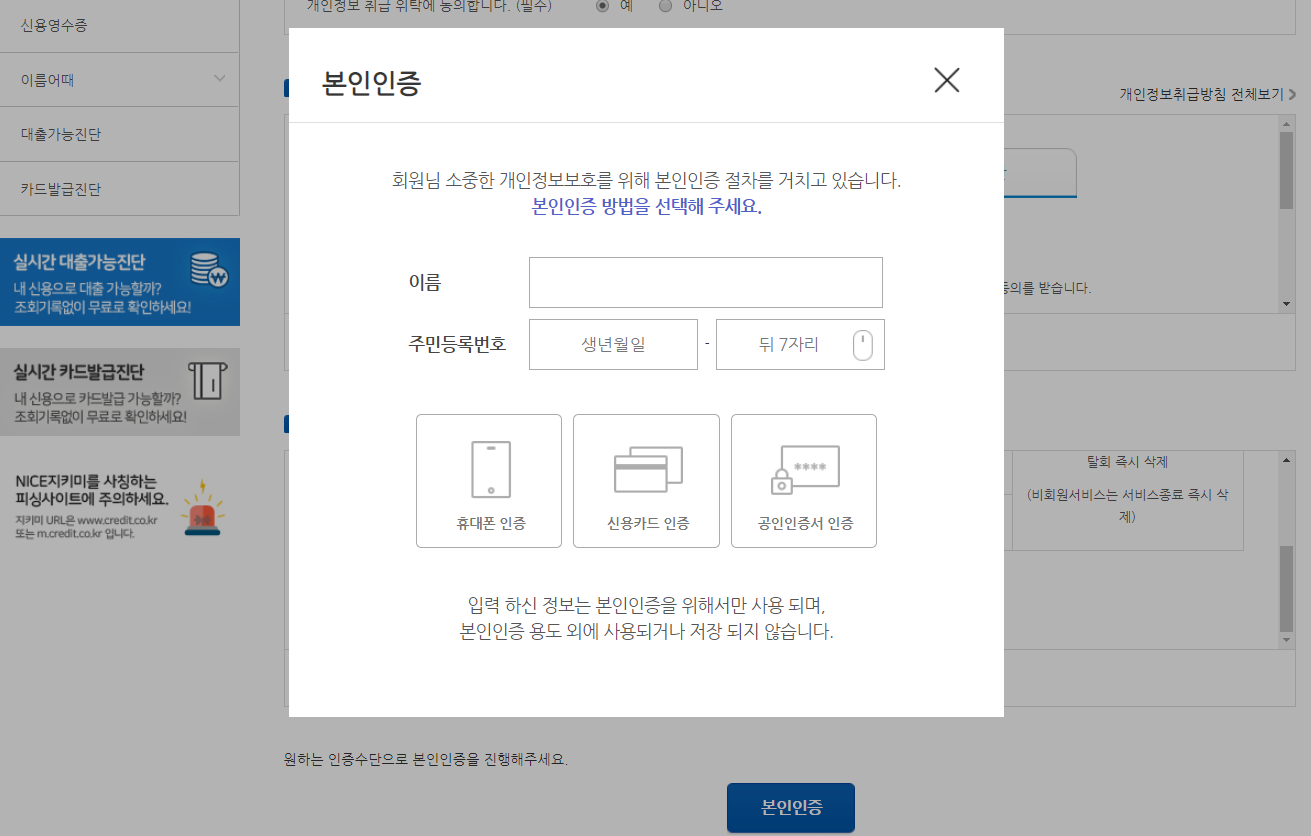 올크레딧을 통해 무료신용조회를 하기 위해서는 휴대폰이나 카드를 통한 인증이 필요한데요.