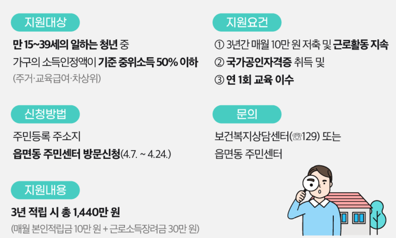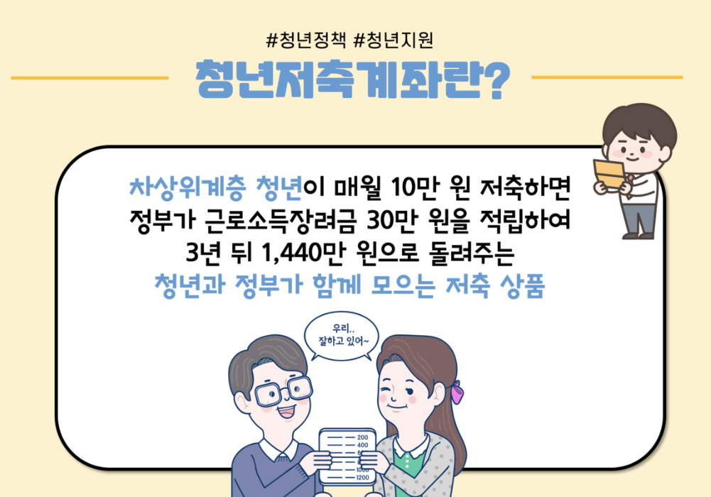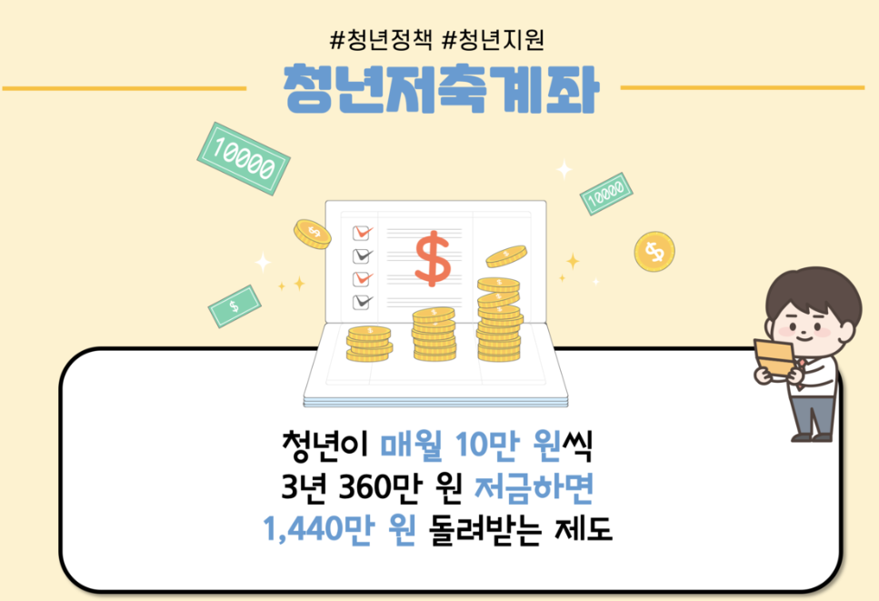 청년이 매월 10만 원씩 3년 동안 360만 원을 저축하면 1440만 원으로 돌려받는 제도입니다.