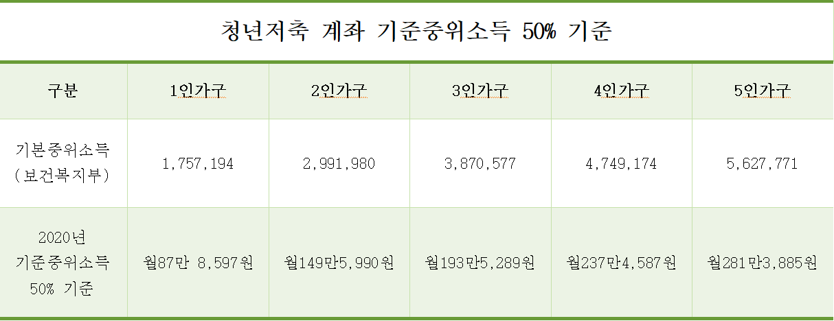 기준중위소득 50% 청년저축 계좌 조건 2020년 기준 중위소득을 기준으로 할 때 50% 이하는 다음과 같습니다.