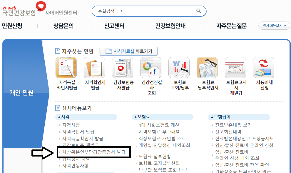 차상위계층 확인서 발급받기 국민건강보험공단 사이버민원센터에 들어가면 자격을 확인하는 칸이 보입니다.