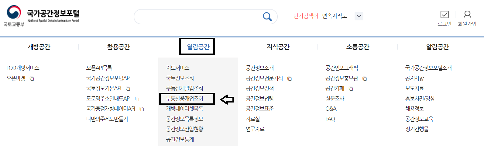 부동산중개업조회 상위 탭에 보면 로그인 없이도 열린 공간을 통해 부동산중개업 조회를 할 수 있습니다.