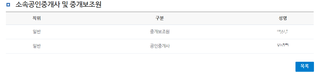 중개보조원 소속공인중개사 대표자에 대한 정보뿐 아니라 흔히 부동산에서 실장이라고 불리는 중개보조원, 소속 중개사의 정보도 확인이 가능합니다.