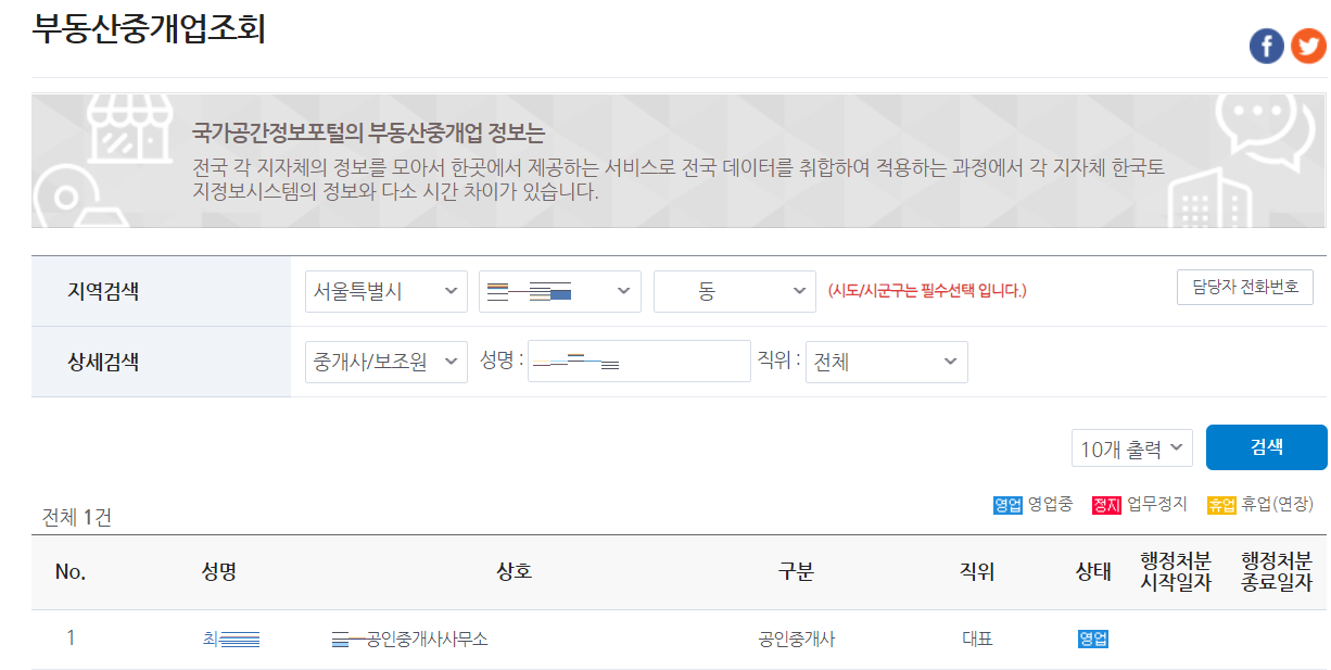 부동산 중개업조회 먼저, 중개사나 중개보조원의 이름과 지역을 통해서 실제로 운영되고 있는 공인중개사 사무소인지 확인을 할 수 있습니다.