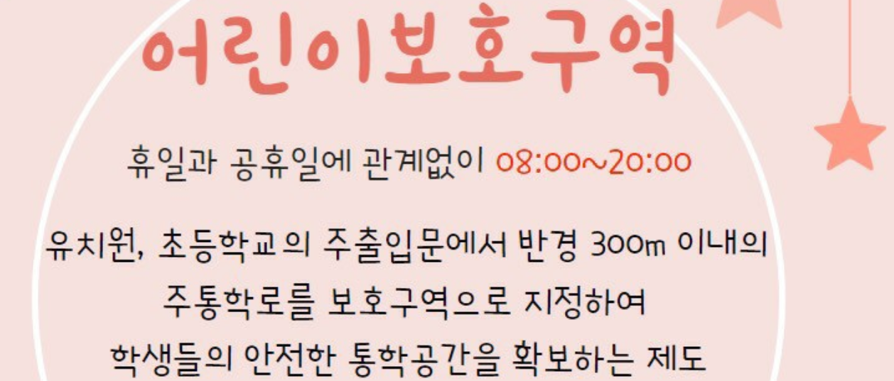 유치원, 초등학교의 주출입문에서 반경 300m 이내의 주통학로를 보호구역으로 지정하여 학생들의 안전한 통학 공간을 확보하는 제도 입니다.