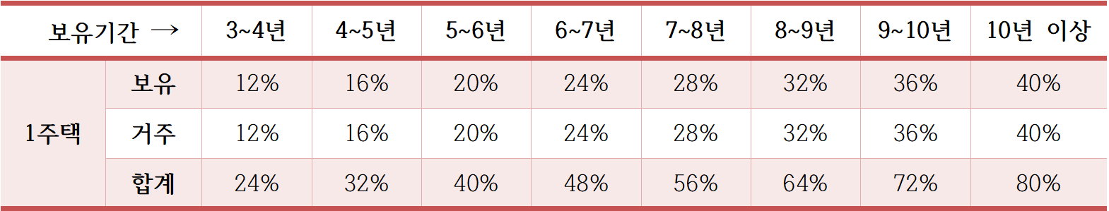 반면 1세대 1주택의 경우 연8%씩 10년 이상 보유시 최대 80%의 양도소득세 장기보유특별공제를 적용받게 됩니다.