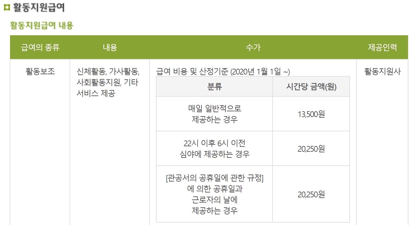활동보조 지원급여 활동보조 지원급여의 경우 시간에 따라 13,500~20,250원까지 급여비용을 지원해주고 있습니다.