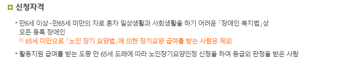 신청자격 : 만 6세 ~ 만 65세 미만이며 혼자 일상생활과 사회생활을 하기 어려운 ‘장애인복지법’상 모든 등록 장애인
