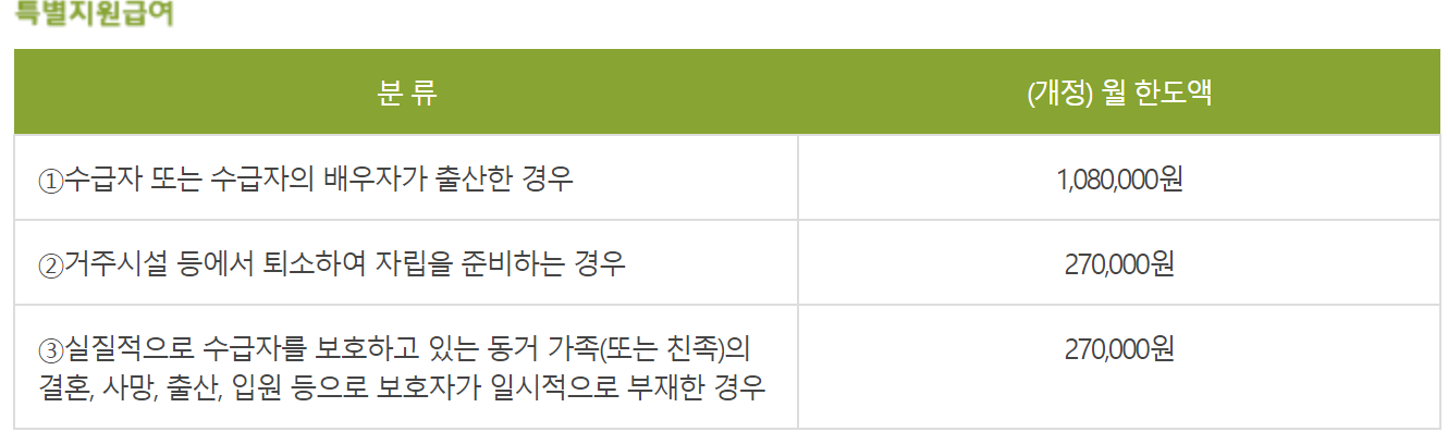 장애인이 결혼을 하여 출산을 할 경우나 거주시설등에서 퇴소를 하여 자립할 경우 특별지원급여 또한 제공하고있습니다.