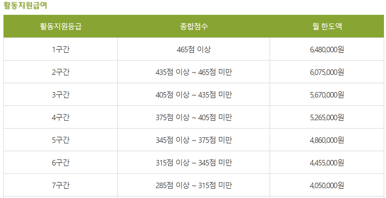 8~15구간 1~15구간으로 나누며 최대 8배 정도까지 활동 지원급여 한도액이 차이나게 됩니다.