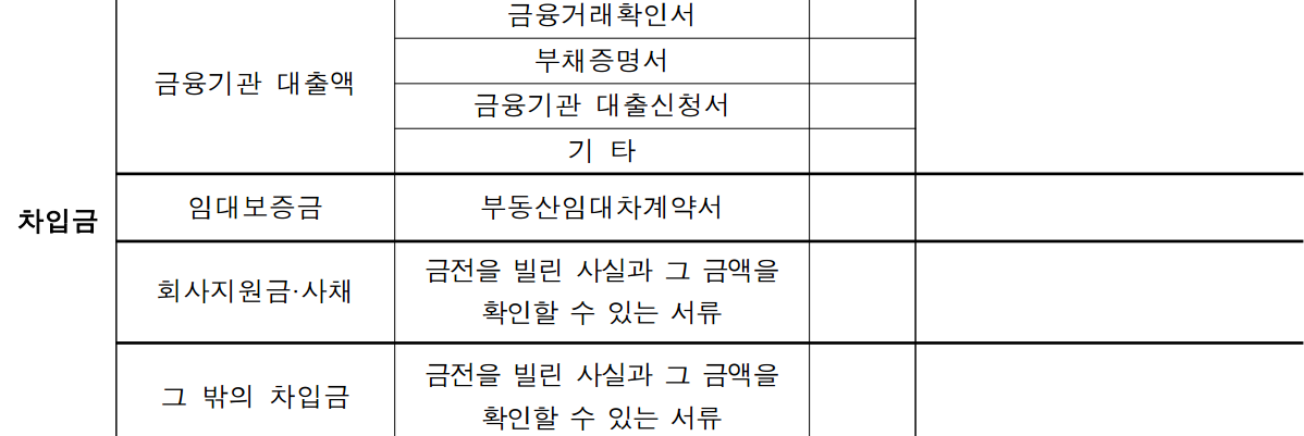 차입금에 대한 증빙서류 차입금에 대한 증빙서류로는 대출액을 확인할 수 있는 부채증명서, 금융거래확인서, 대출신청서와 임대보증금에 대한 임대차계약서, 회사에서 발급해주는 지원금 서류 등이 필요합니다.