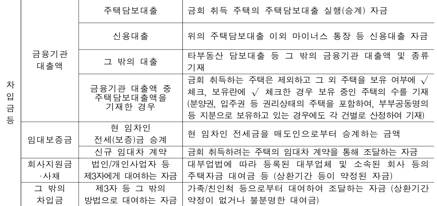 자기자금란 작성시 유의사항 ②차입 금란에는 주택 취득을 위한 주택담보대출, 신용대출 등과 지금 부동산에 세를 주고 있다면 임대보증금 등이 속합니다.