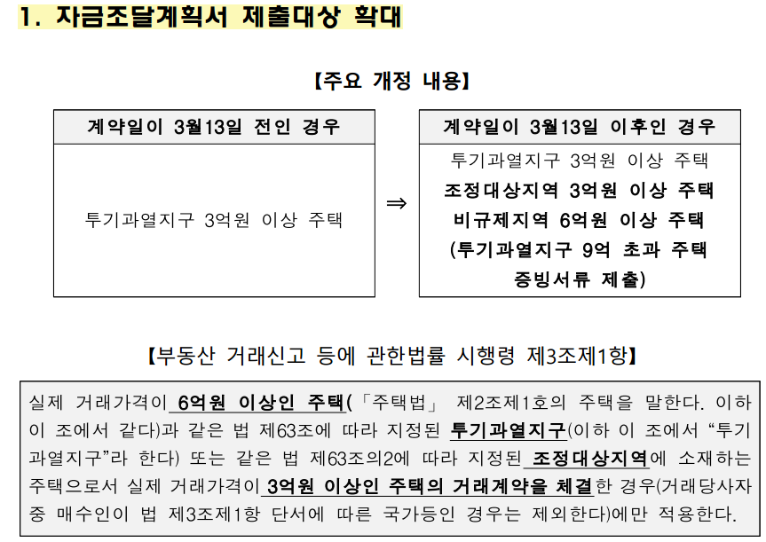 주택자금 조달계획서 제출대상 확대 계약일이 3월 13일 저인 경우 투기과열지구 3억 원 이상 주택에 대해서만 주택자금 조달계획서를 제출하면 됐었습니다.