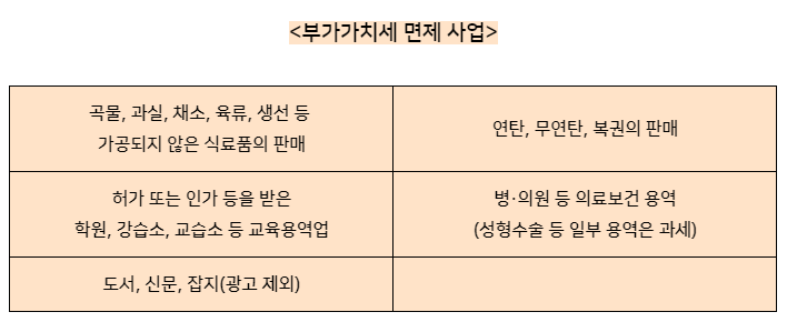부가가치세 면제 사업 부가가치세가 면제되는 신선 식료품, 교육업, 신문, 의료보건 용역 등이 있습니다.
