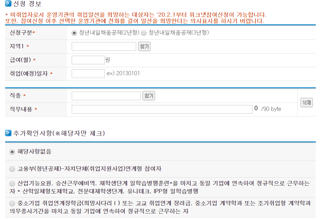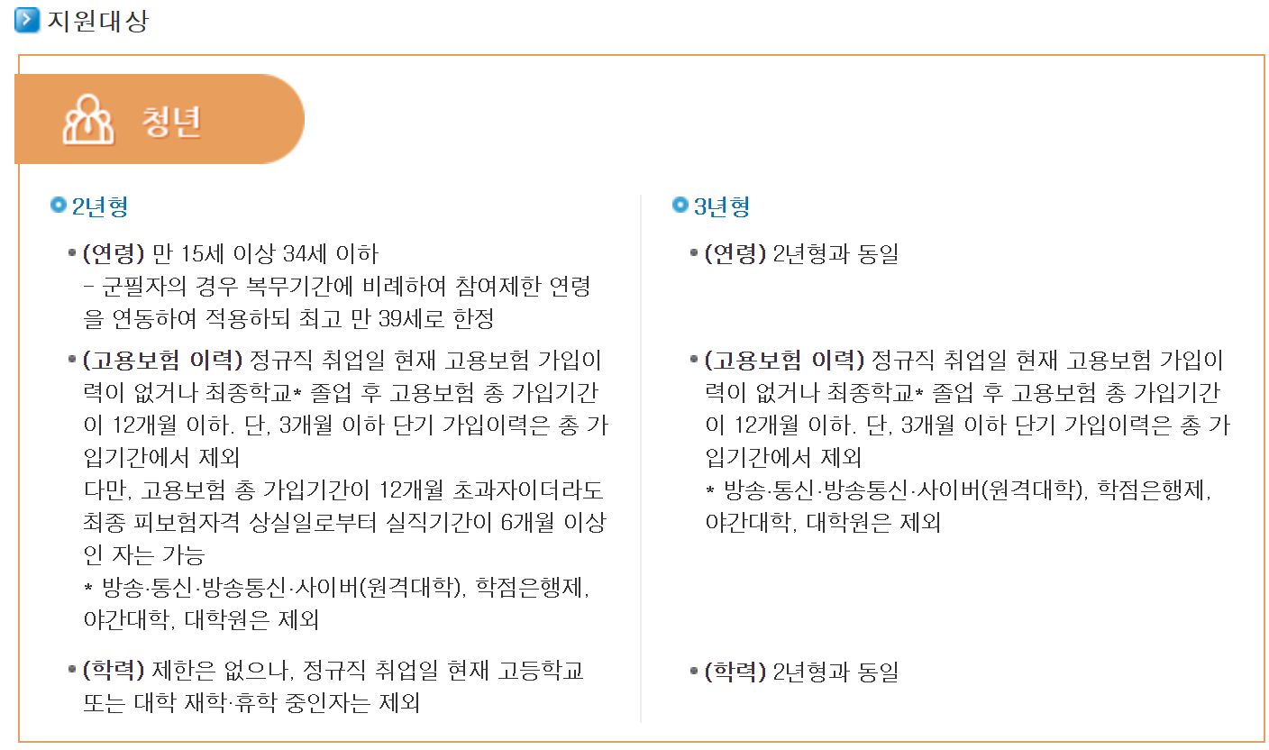 ②고용보험 이력의 경우 2년형, 3년형 모두 정규직 취업일 현재 고용보험 가입이력이 없거나 최종학교 졸업 후 고용보험 총 가입기간이 12개월이하인 경우 가능합니다.