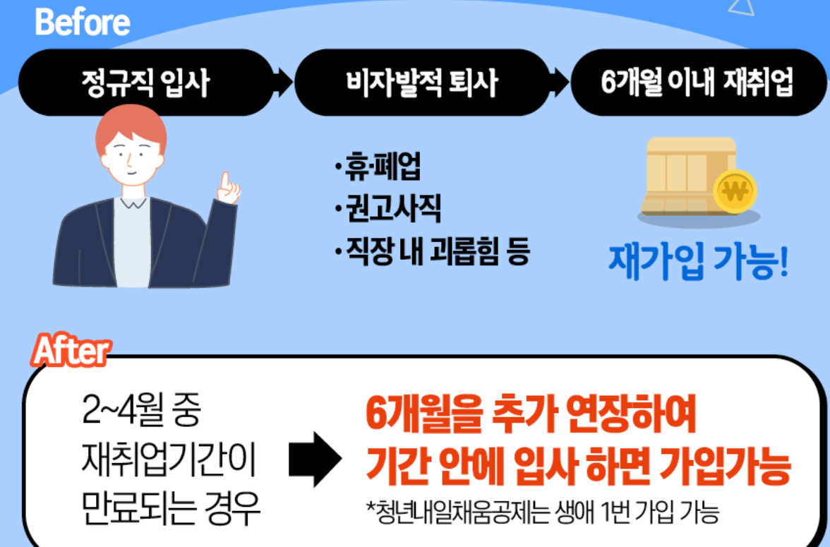 청년 내일채움공제 재가입 조건 원래 청년내일채움공제는 생애1번 가입되기 때문에 신중히 선택도 해야하는데 비자발적퇴사를 통한 경우 가능하며, 2~4월 중 재취업기간이 만료되는 경우에도 6개월을 추가 연장하여 기간안에 입사하면 가능하도록 바뀌었습니다!