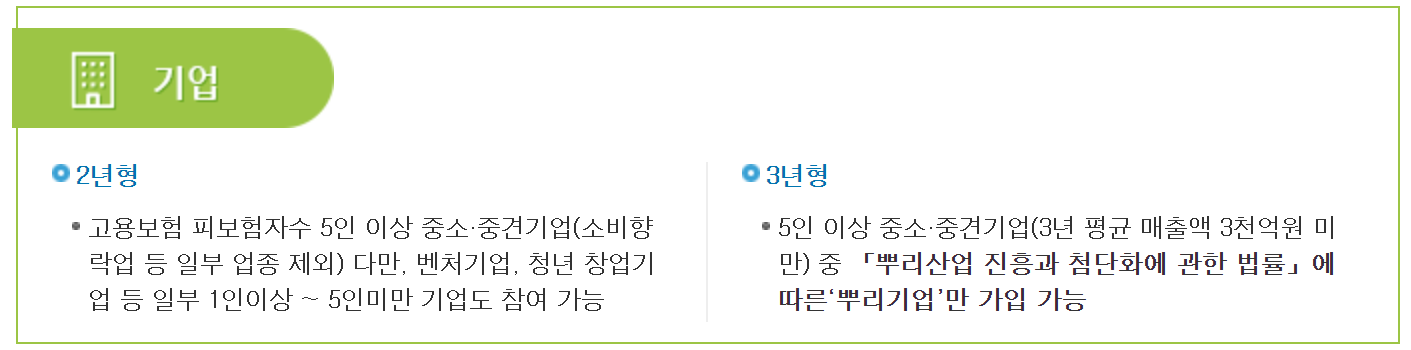 청년 내일채움공제 기업자격 2년형의 경우 고용보험 피보험자수 5인이상 중소,중견기업과 벤처기업, 청년 창업기업의 경우 일부 1인이상~5인미만도 참여가 가능합니다.