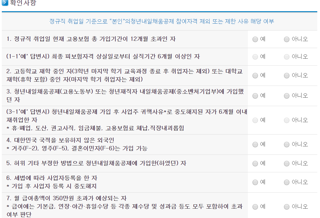 읽어보시고 꼼꼼하게 작성한 후에 마지막으로 정규직 취업일 기준으로 “본인”의청년내일채움공제 참여자격 제외 또는 제한 사유 해당 여부를 검사하고나면 신청이 완료됩니다.