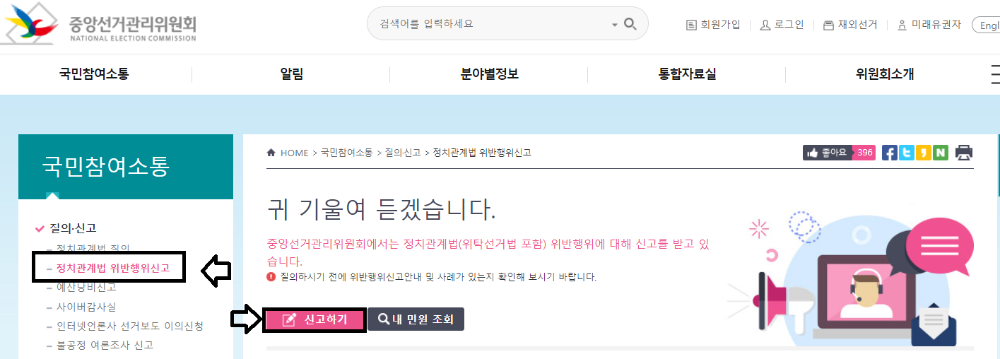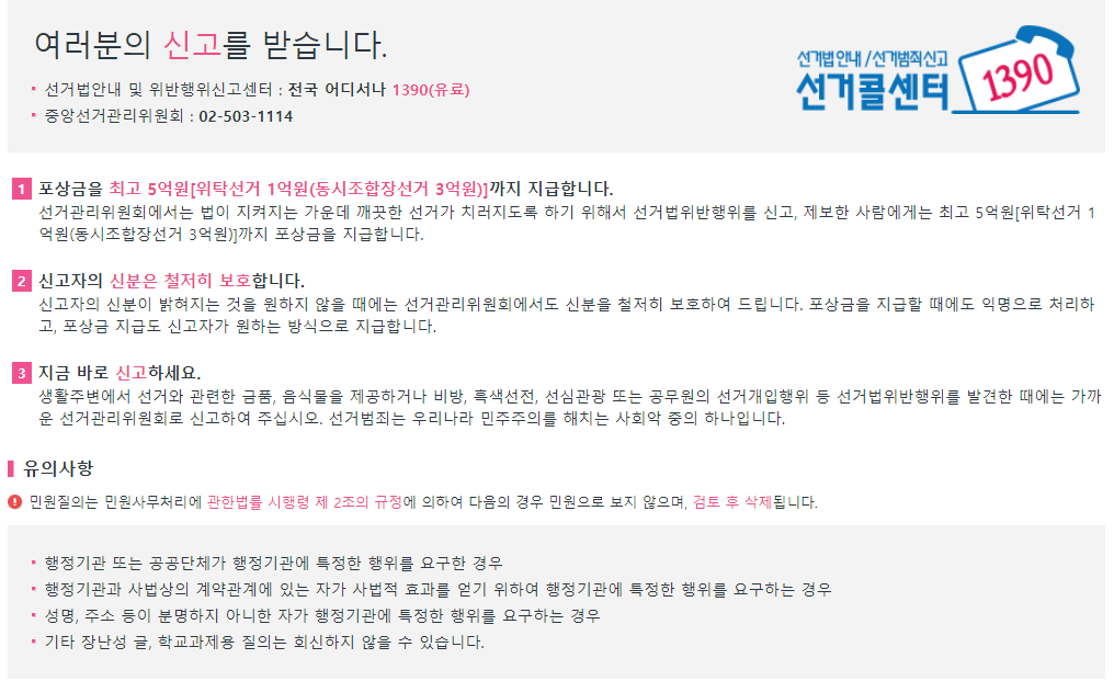 중앙선거관리위원회 신고방법 먼저 중앙선거관리위원회 홈페이지에 들어가서 [질의 및 신고] 란에서 정치관계법 위반행위 신고하기를 하면 됩니다.