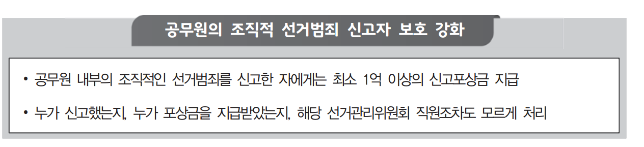 공무원 내부조직 고발 공무원 내부 조직의 조직적인 선거범죄를 신고한 자에게는 최소 1억 원 이상의 신고포상금이 나가는 기준도 있습니다.