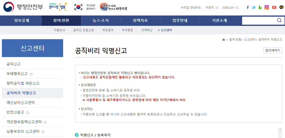 선거범죄 신고 다음으로는 행안부 참여 민원-신고센터-공직비리 익명신고를 이용할 수 있습니다.