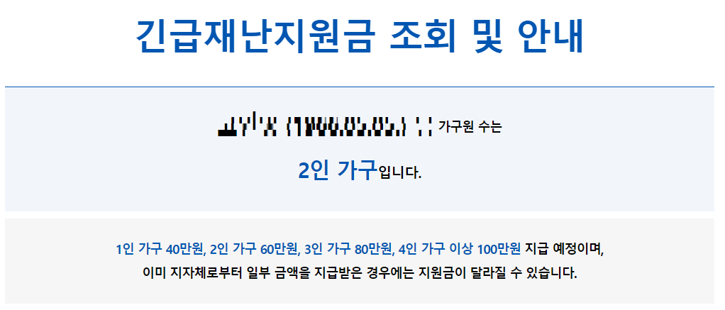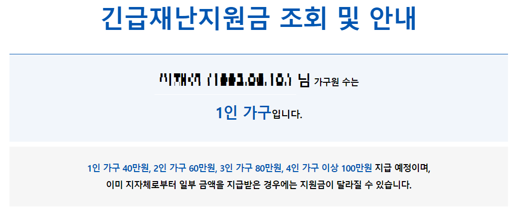 긴급재난지원금 조회 결과 자신의 이름과 생년월일을 바탕으로 1인 가구, 2인 가구 등 표시가 바로 나와서 내가 얼마를 받을 수 있는지 확인이 가능합니다.