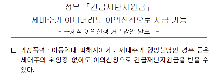 A. 가정폭력·아동학대피해자이거나 세대주가 행방불명인 경우 등은 별도 가구로 산정하여 세대주의 위임장 없이도 이의신청으로 긴급재난지원금을 받을 수 있습니다.