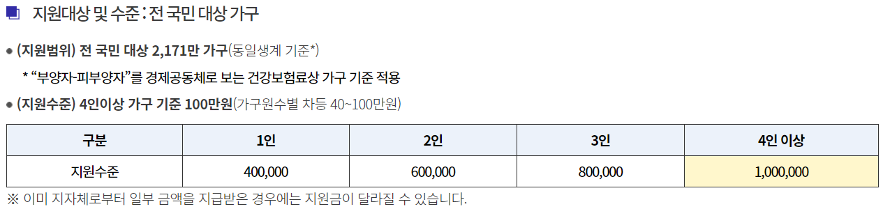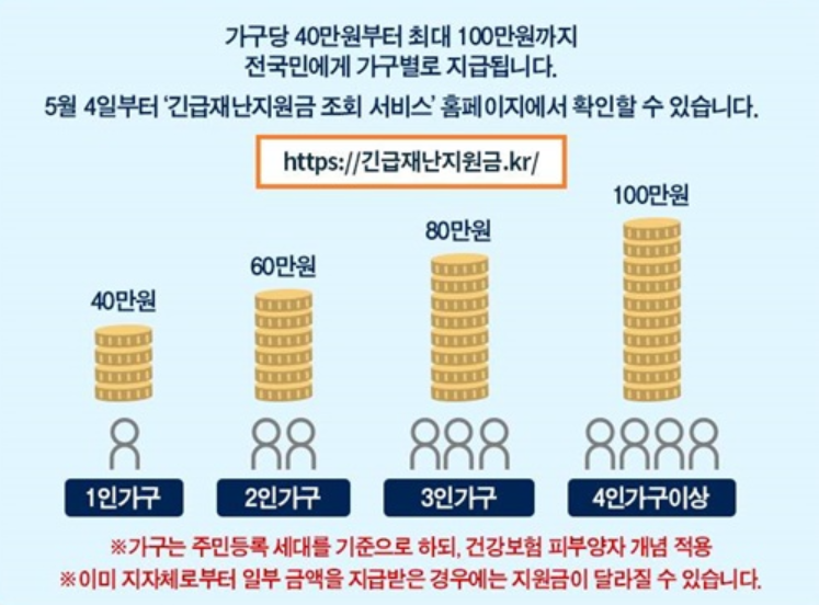 지원금액 전 국민을 대상으로 긴급재난지원금이 나가는데 1인 가구의 경우 40만 원입니다.