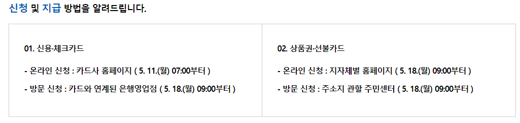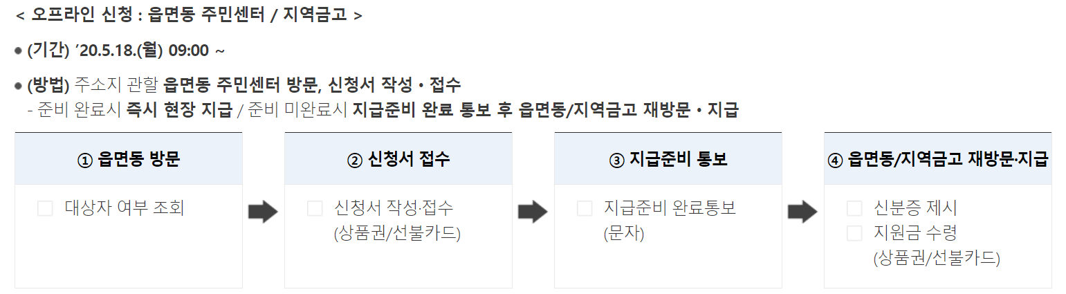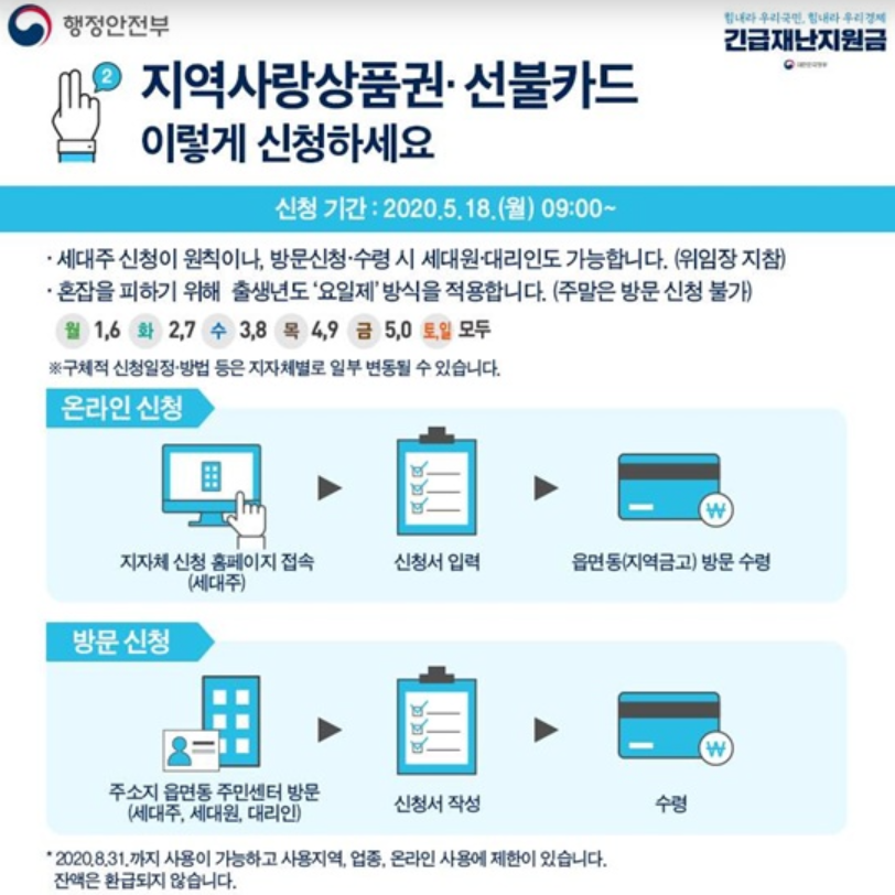 역시나 5월 18일부터 지자체 홈페이지를 통해 온라인 접수하거나 읍면동주민센터를 방문하여 오프라인 신청 가능합니다.