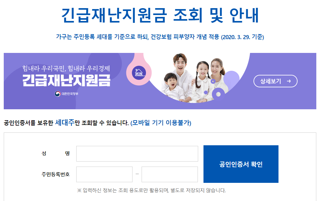 긴급잰나지원금 조회하기 긴급재난지원금 조회 사이트에 들어가면 바로 위와 같은 화면이 나옵니다.