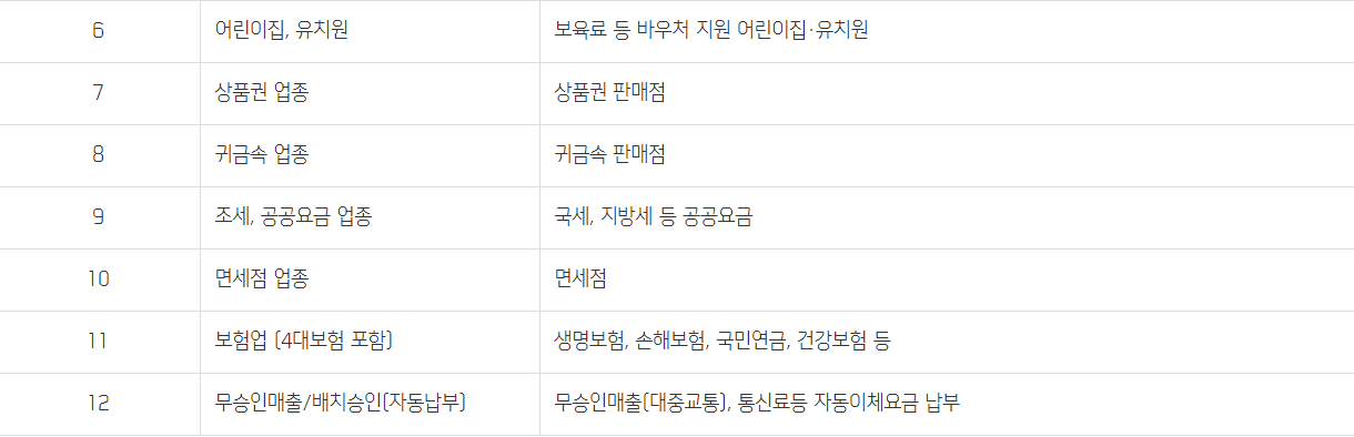 사용 제한 업종 유흥업종 제외 상품권, 세금, 면세, 보험 등 제외 모든 곳에서 사용이 가능한 것은 아니며 백화점, 대형마트, 온라인 거래 등 일부 사용이 제한됩니다.