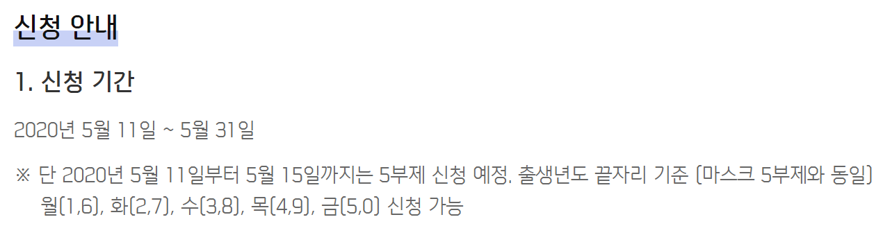 신청기간 단, 5월 11일부터 5월 15일까지 처음 신청 시 마스크 5부제와 동일하게 신청 제한이 있습니다.