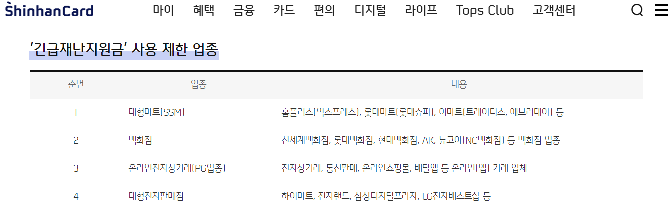 ▼신한카드 재난지원금 사용제한업종